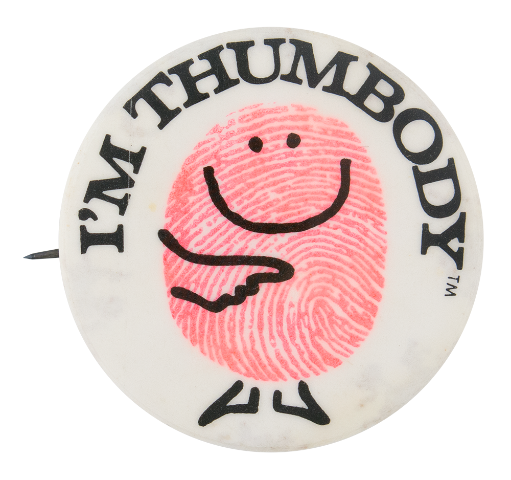 | Information: | Thumbody was created by Peter Petraglia, the creative director at Princeton Partners in 1971 as part of a financial services campaign sold to banks and credit unions across the United States. Thumbody was based on one of the agency partner’s own fingerprint. As part of the I’m Thumbody program ads, posters, shirts, banks, pins and other promotional items were created with the Thumbody design. |